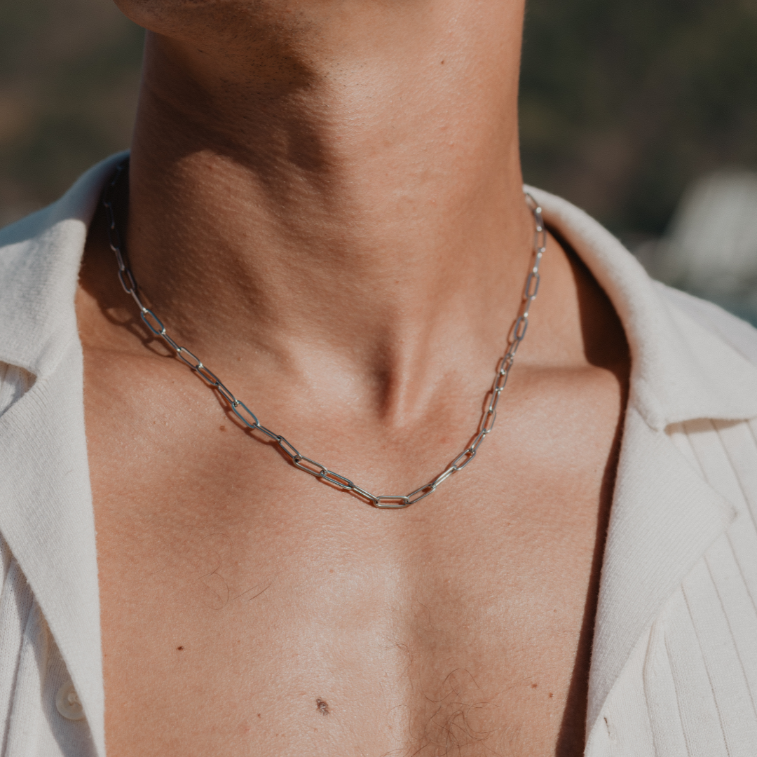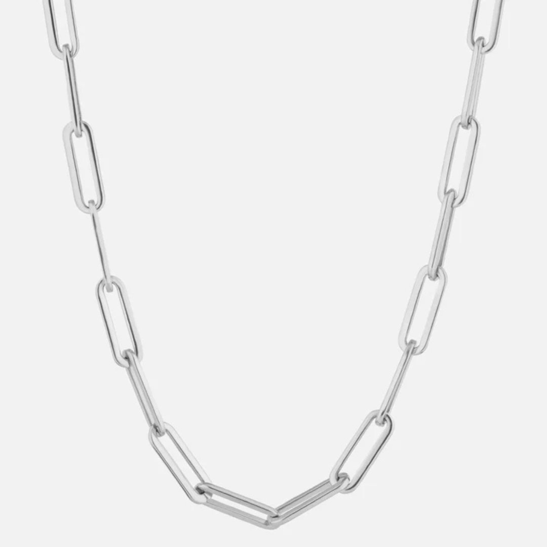 A contemporary chain with a sleek, paperclip-inspired aesthetic.